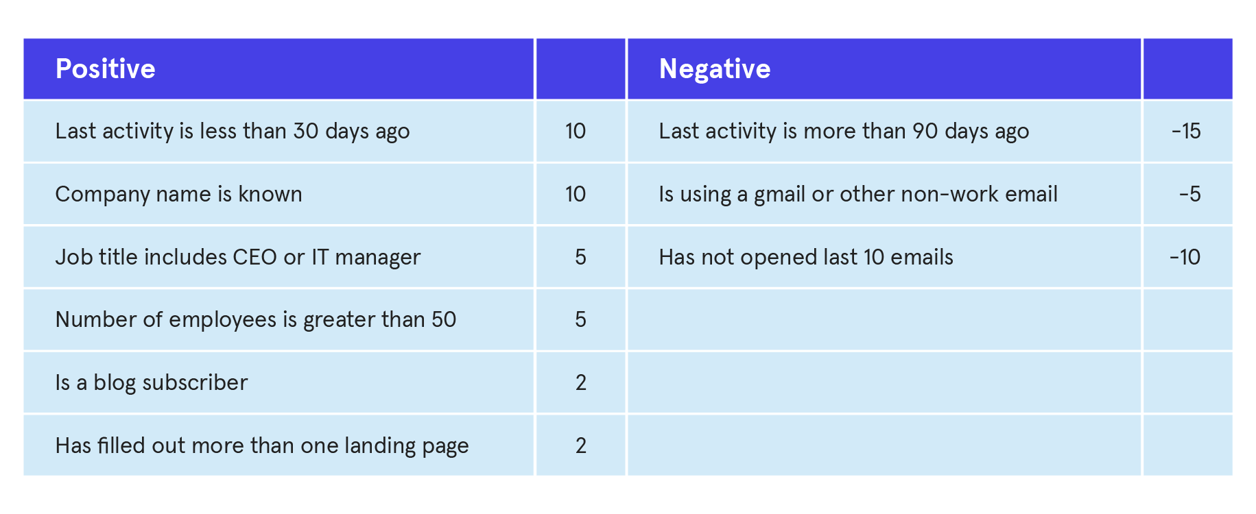 A contact who was on the site five days ago, who is a subscriber that has filled in two landing pages, who has a job title that includes ‘CEO’, but who is using a gmail account would therefore have a score of 14.